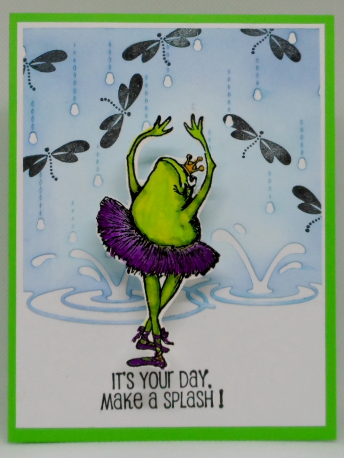 Party Time is the challenge + dragonfly is the challenge for the Paper Dragonfly Creative Challenges blog. What goes better with a dragonfly but a toad and a toad in a tutu dancing in the rain and puddles? My quirky sense of humor was the inspiration for my card today. After diecutting the background, I stamped, colored and fussy cut the Stampendous Tutu Toad stamp, added my Gina K Designs dragonflies from Dreams Take Flight stamp set and stamping the sentiment, also GKD, Blooming with Blessings stamp set.