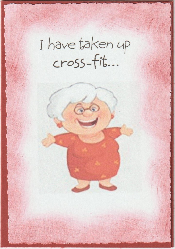 As soon as I saw the sentiment…“I have taken up cross-fit… I cross my fingers and hope that my clothes fit.” I thought of d-o-s because one of her granddaughters & husband own a cross-fit gym. The lovely lady image was found online. Edges of the white layer were cut on an antique paper cutter, then I used a cotton ball with Rich Razzleberry stamp pad to create a border.
