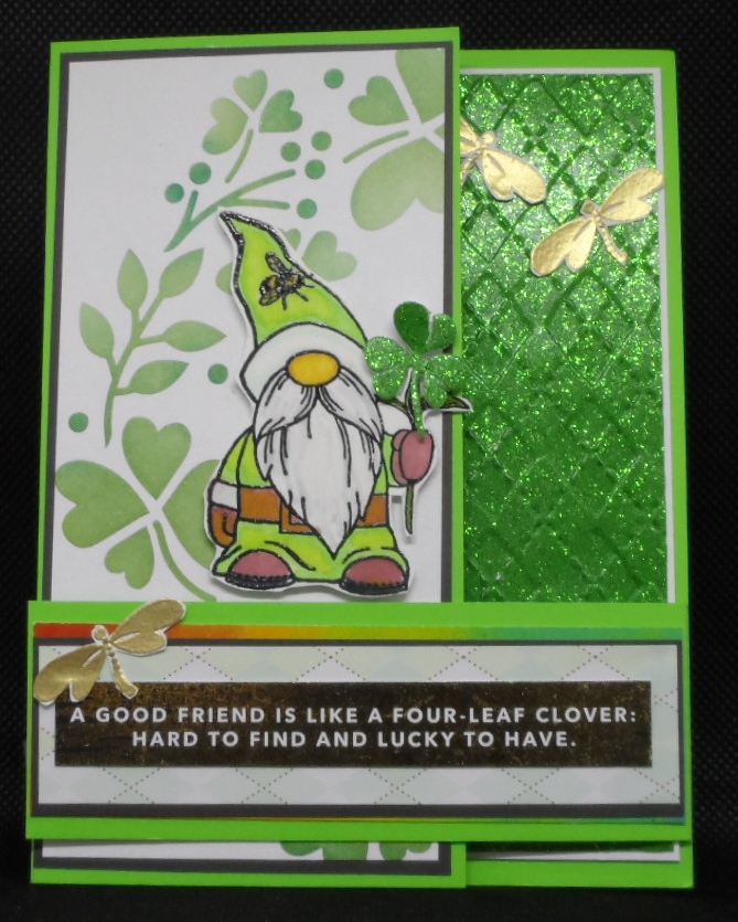 Using SimonSaysStamps Clover Wreath Stencil, Cuttlebug Argyl embossing folder on green glitter cardstock, a scrap of argyl patterned paper, SSS sentiment strip which was foiled in gold, stamping and gold heat embossing embossing and fussy cutting out 3 dragonflies from Gina K Designs’ Dreams Take Flight stamp set and an Inkadinadoo fussy cut Garden Gnome stamp holding a die cut glitter clover completes my card.