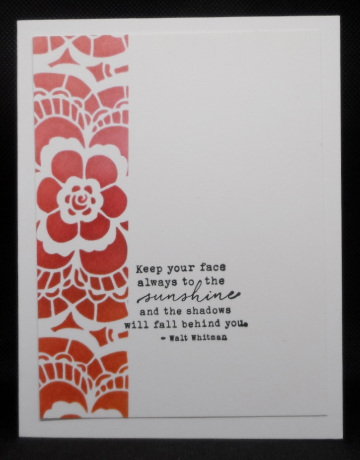 Using the Tim Holtz Layering Lace stencil and very, very carefully masking my border, I ink blended pink, red and orange inks. Unfortunately these inks seemed closer in shades then I expected so the don’t have a lot of dimension. A sentiment from Taylored Expressions’ Scenic Sentiments stamp set and this card is completed. AND no fingerprints!! Nope, not adding anything else!!