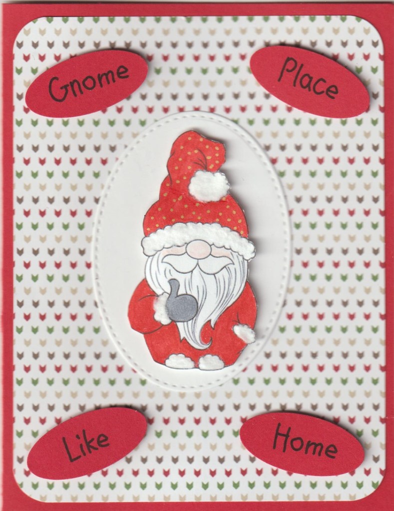Pp is from Stampin Up’s Trim The Tree Designer Series Paper Stack, gnome is from an online coloring page colored with Copics. Dots on the hat were done with a gold metalic pen that was gifted to me, hat trim and cuffs have white fun flock from Martha Stewart. Sentiment ovals are a SU punch I didn’t know I had, oval die cut is Stitched Ovals by Di-namics. Gnome and sentiment ovals are all popped up. Words were printed on the computer.