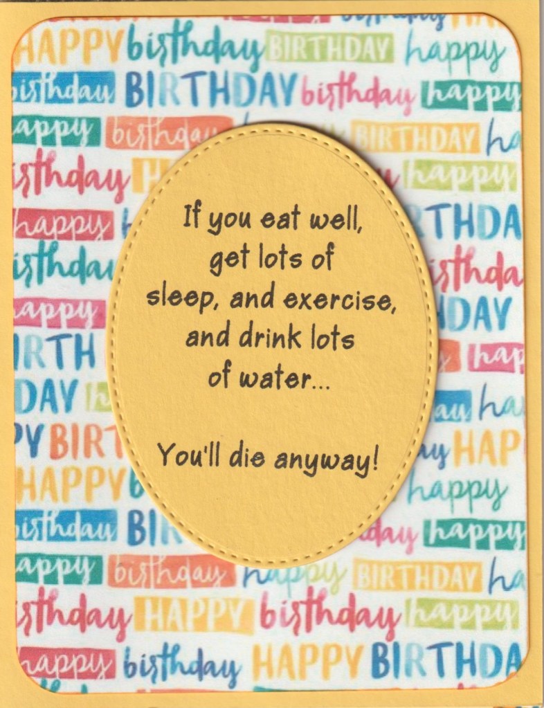 Patterned paper and sentiments were found online. Outside sentiment is a recent find and the inside sentiment has been in my file for several years. I thought they combined pretty well. Oval die is Stitched Ovals by Di-namics. That seems to be my go-to die lately.