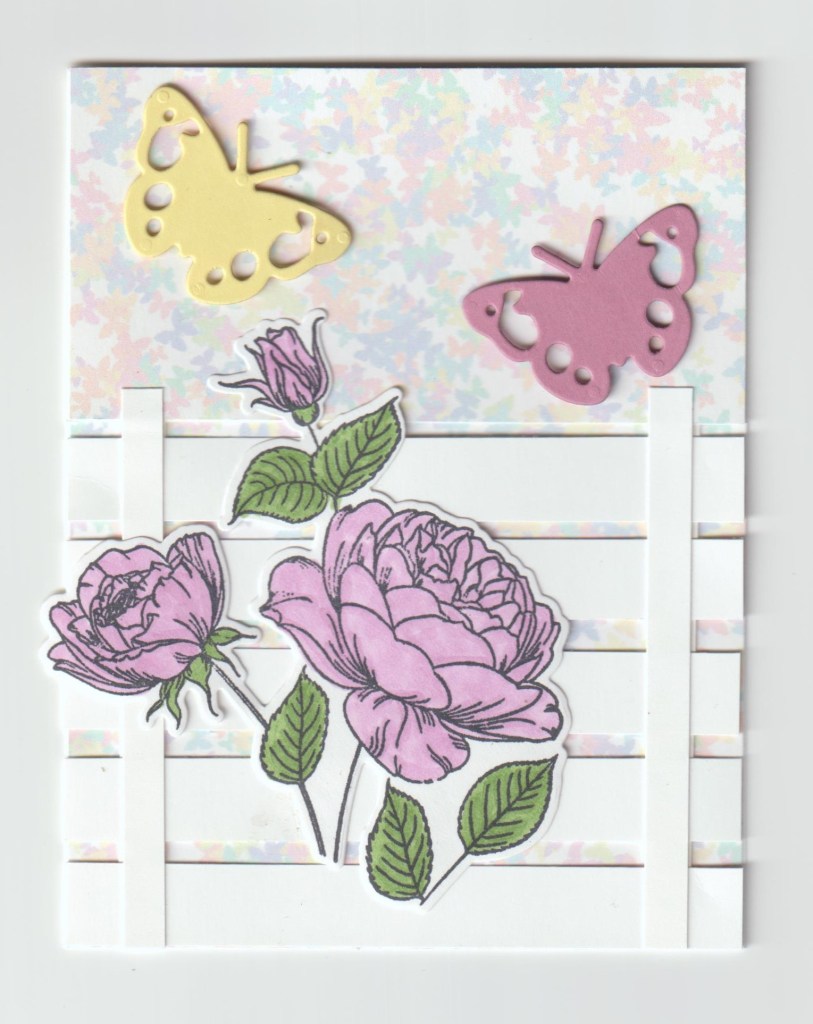 Patterned paper on the top front and lower inside was found online, die cut rose is Gina K’s Tropical Blooms colored with Copic’s, butterflies are Butterfly 2 from Dies R Us. Butterflies have a piece of mounting tape in the center so the wings aren’t attached to the background.