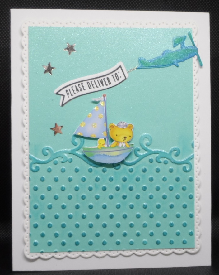 Today’s card will be for a sweet little one. Since the Hero Arts My Monthly Hero stamp kit was still on my desk from a previous card, I incorporated the die cut airplane and stamped the banner as it flies overhead of my little bear in a boat. This is a fussy cut ephemera image that I saved from a baby card I received after my grandson was born almost 9 months ago. For my embossed part of the card, I used a Sizzix embossing folder. After embossing on shimmer cardstock, I swiped a teal ink pad over the raised portions for a little more color. This embossing folder reminded me of ocean waves and bubbles and thought it would work well with the little boat. When we go to the Jersey shore there are always airplanes with advertising flying over the Atlantic Ocean and this was my inspiration.