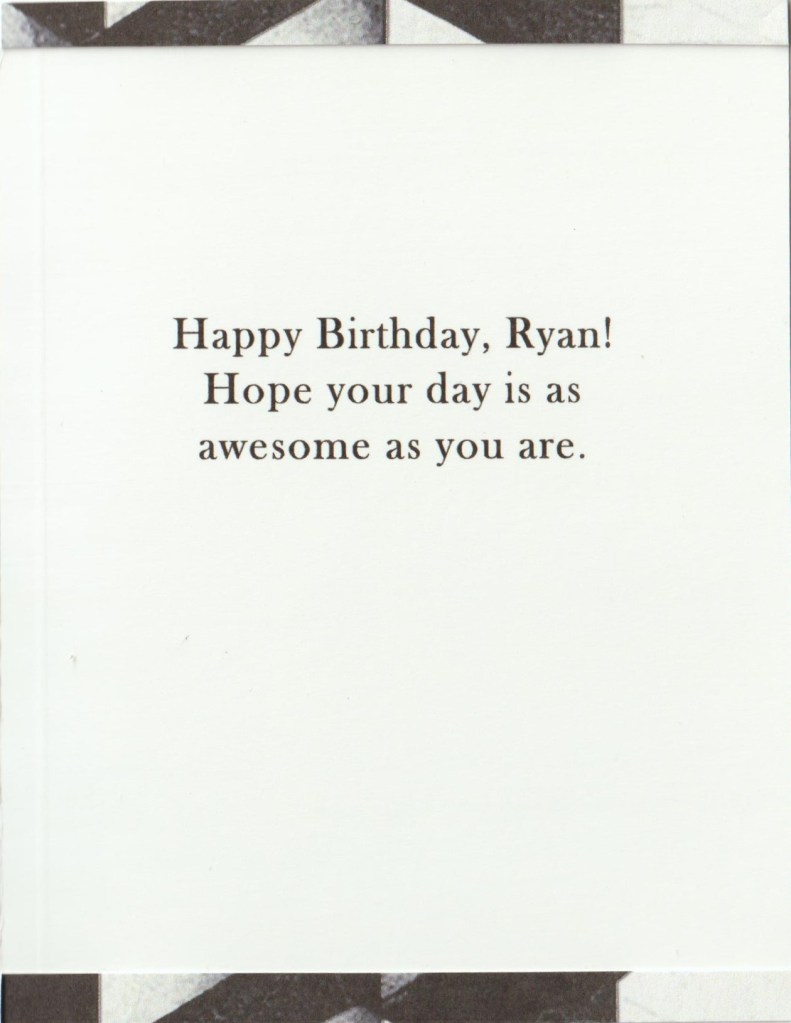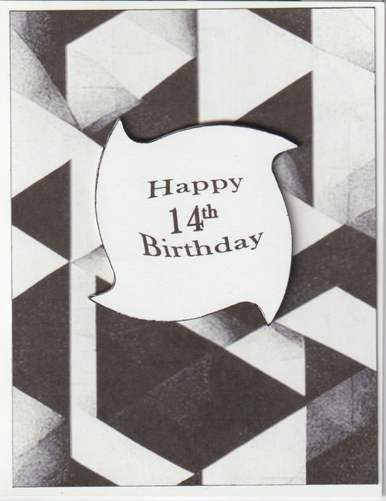 Oh my, great-grandchildren grow up way too fast. Today’s card is for our second oldest great-grandson. I didn’t really have any idea of what kind of card to make but I thought a black & white background might be kind of cool so off to Google I went and found this kind of funky pattern. Then I thought a funky background should have a wonky square accent. Wonky square is from the Silhouette, then I printed the sentiment from my Hallmark program. My little brain just hasn’t figured out the print and cut feature of the Silhouette. Square is popped up. Here’s a look at the inside.