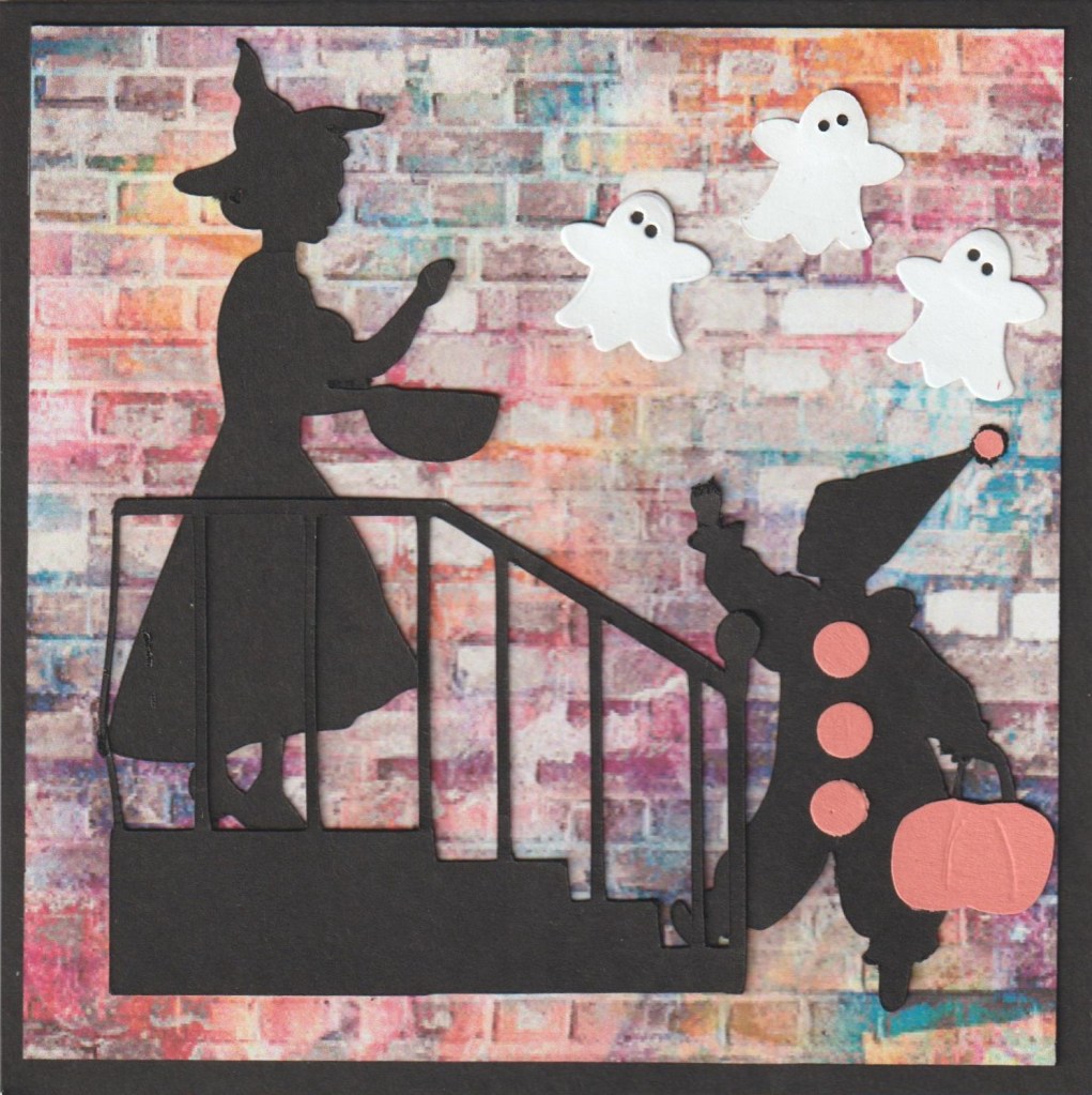 Hello and welcome. Again, my background paper was found online. Silhouette images are from the Silhouette, ghosts are from a very old Provo Craft metal multi-images die. After getting the Silhouette images sized right it was fairly easy to make. This will be entered in 3 Halloween challenges.