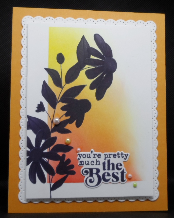 The Taylored Expressions Daisy Dreams stamp, stencil and die set I believe will stay within my arms reach for awhile yet. I’m loving this set. After watching Gina K Designs Stamp & Chat Live YouTube video on Silhouette Stenciling, I decided to give it a try. After masking off the left side and bottom of my card, I ink blended oranges and yellow inks. I did stamp the Daisy Dreams image for the stems to show then used the layering stencils and inked all layers in black ink. My bottom edge got a little wonky so I had to cover with the die cut sentiment otherwise I would have placed that sentiment in a different location. It was a fun new to me technique.