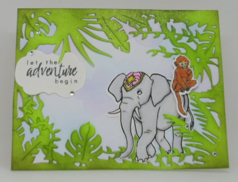 4. As a former teacher, I can imagine the fearful thoughts for the safety of the kindies with those gigantic beasts pressing by! What an adventure! Your card evokes the elephant in it’s natural element and the monkey on it’s back is a cute addition! I love that jungle frame you used. Thanks for joining us for our 300th challenge at As You See It Challenges.