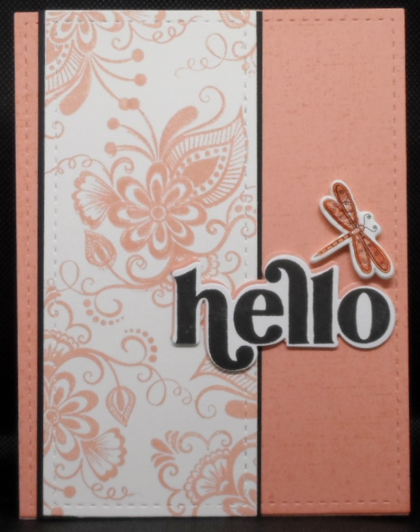 The June color of the month challenge is PEACH! YUMMY!! However instead of using the fruit I decided to just use the color peach. I decided on a Catherine Pooler/Gina K Designs collaboration Stamp of Approval Beautiful World stamp to create my focal in GKD’s Peach Bellini ink. My cardstock is also GKD’s Just Peachy but was too lightweight for a card base so die cut it after stamping it with Taylored Expressions Linen background stamp in the peach bellini ink I added it to a white cardbase. The TE sentiment was stamped and die cut and off set slightly with a little Just Peachy cardstock, too. Then I colored a little Color Me Crazy dragonfly that was a prize from a Double D Things that Fly challenge.