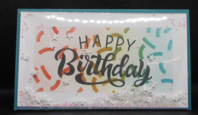I don’t do a lot of slim line card or a lot of shaker cards, but one of the classes in my Taylored Expressions Virtual Stamp Joy 2023 class was to make a card using both of these usually don’t dos. The mini slimline card panel was masked off to create an inside portion that was ink blended and then using a Party Popper TE stencil and a heavier hand stenciled the same colors over the ink blended background. The HB sentiment was stamped in TE’s Oreo ink and then the Mini Slim Infinity Shaker panel was added. I actually remembered to add the star shaker bits before sealing the 4th side of the acetate panel. Mounted it on some teal card stock from Michaels to complete my card.