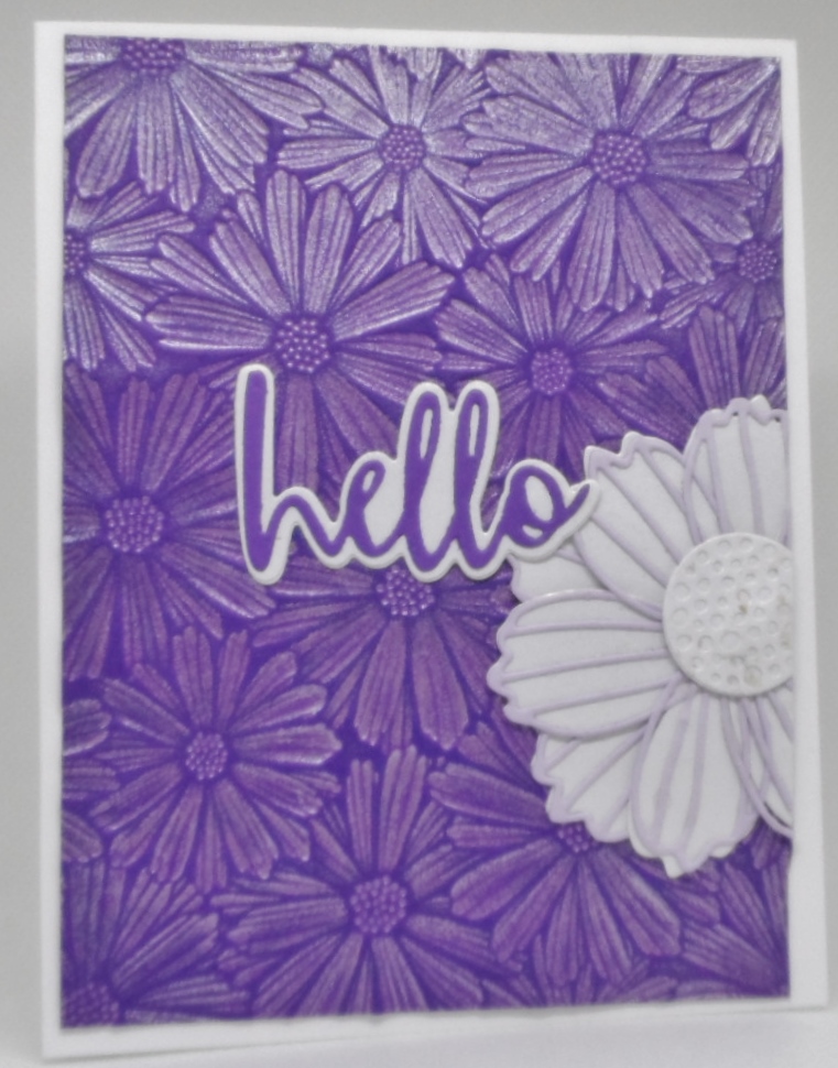 After watching Jennifer McGuire’s New Embossing Folder Technique on YouTube today, I decided to give it a try. The technique is to use a silver pigment ink on the raised side of the embossing folder, run through your machine and then brayer ink of the same color as your cardstock on top. I didn’t have any silver pigment ink so I tried Archival Brillance Pearlescent Purple ink which gave me some shine and lightness on the debossed sections of the panel. The 3D embossing folder is SimonSaysStamp’s Floral Field, SSS Cosmo Flower Petals and Script Hello dies and Gina K Designs Wild Lilac ink completed my card.
