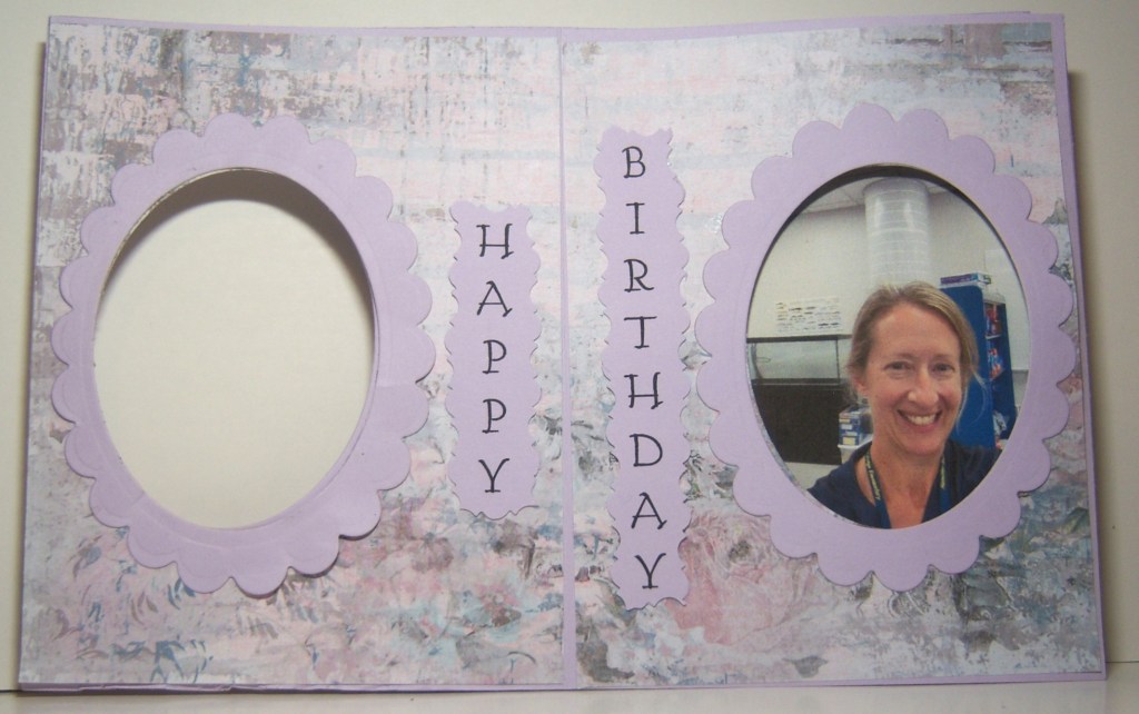 Papers are all The Paper Studio from Hobby Lobby, ovals are Spellbinders Scalloped and Classic ovals. Numbers are from the Silhouette, doubled with Glossy Accents on them. Photo corners are from a hand punch then I ran them through a dots embossing folder. Inside sentiment was printed on the computer then fussy cut with a decorative scissors. Her 50 year picture is a selfie.
