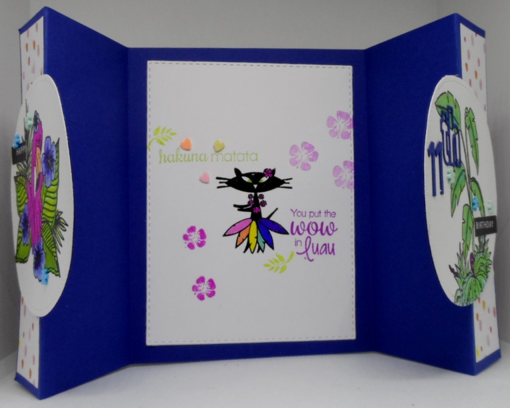 And yes there is even the most for this sweetie. The inside was stamped using Hula Cat from The Cat’s Pajamas and Aloha Diva from Gina K Designs. The 11th die cut was made using Concord & 9th’s double cut dies. Some bling on all portions completes my card today that will be shared with: