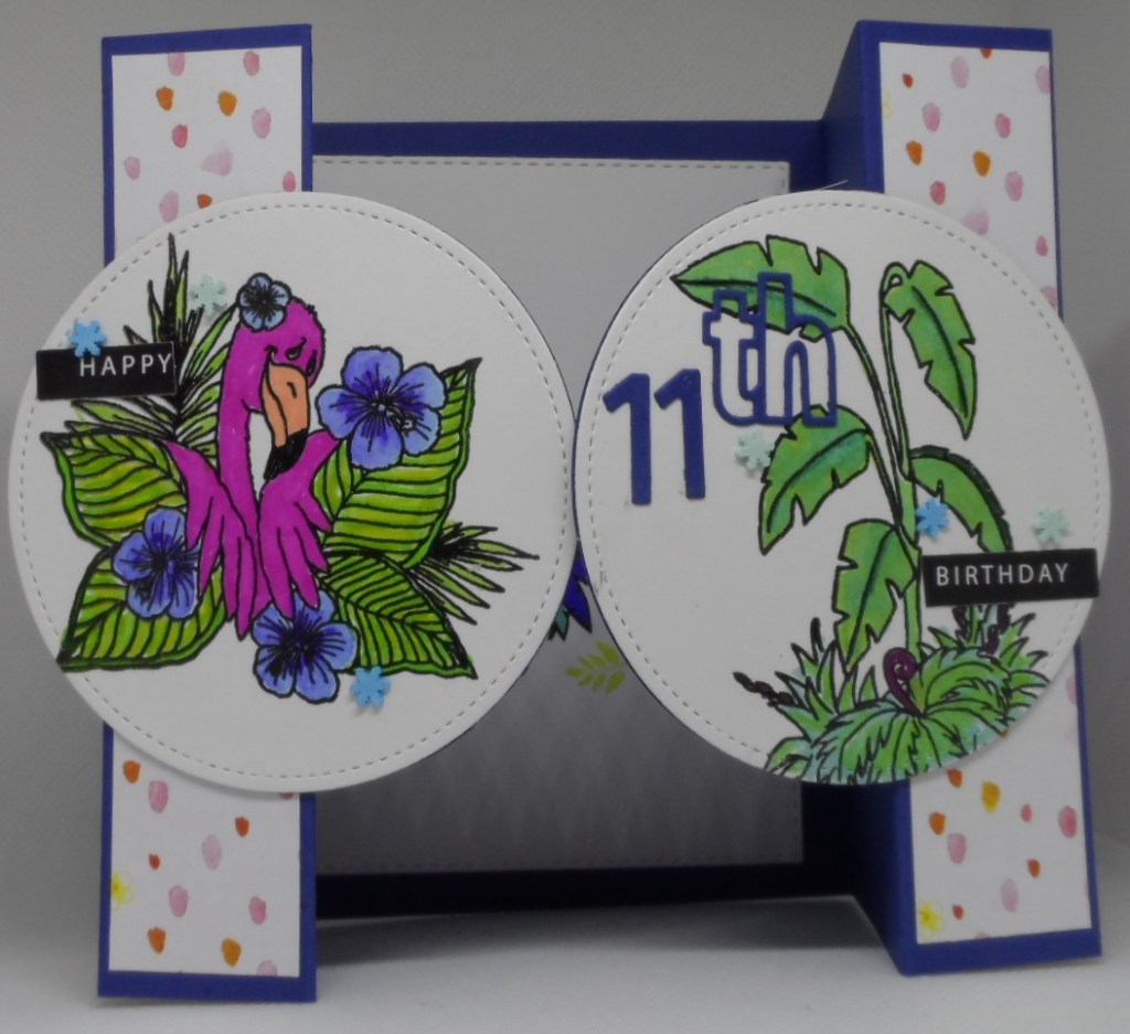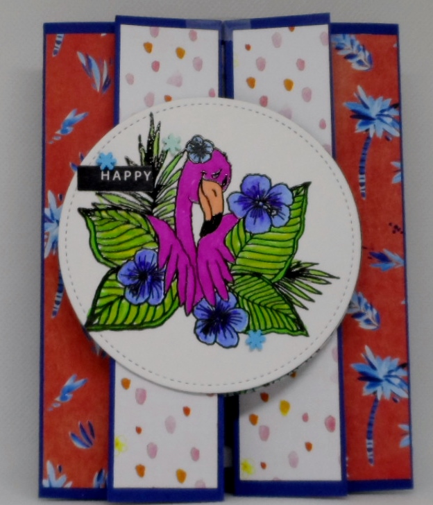 My card is a double gate fold card…two folds folded back on themselves so does that count as four folds? Scored my card, found some cute patterned paper from my stash and then searched for this tropical flamingo image from Great Impressions.