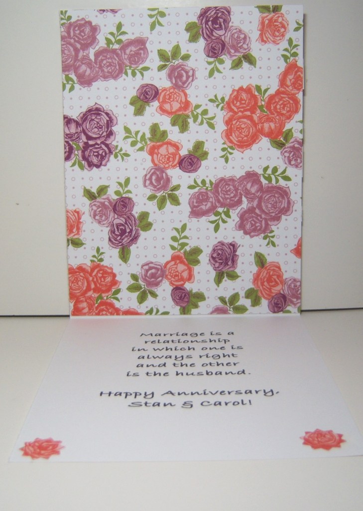 The double-sided pp used is from a (not so recent) 6×6 Stampin Up book. Stamped die cut image is Gina K’s Tropical Blooms. My not so good coloring was done with Copic and Stampin Up’s Stamp and Blend markers. Sentiment was printed on the computer. Not really knowing what to do for a little interest on the top panel I tried using a small circle punch to punch out the center of the flowers on the scrap piece of the floral side of the pp. I think they look ok. I like the idea of the pp on the top inside flap.