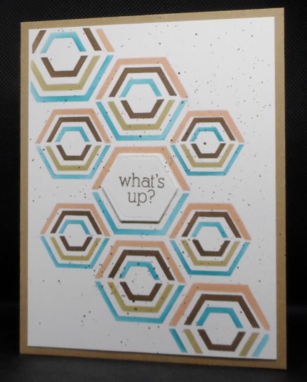 Masculine? Clean and Simple? A little bit of both on my card today. I pulled some inspiration from a Father’s Day card my husband received with the colors and design but I left more “white” space on my card. Using Taylored Expressions Create In Quad’s Hexagon layering stencils, the hexagon die and stamp set and four different inks was all that was needed today. It did look a little too CAS so I added a slight amount of brown spatter to my background and mounted on kraft cardstock.