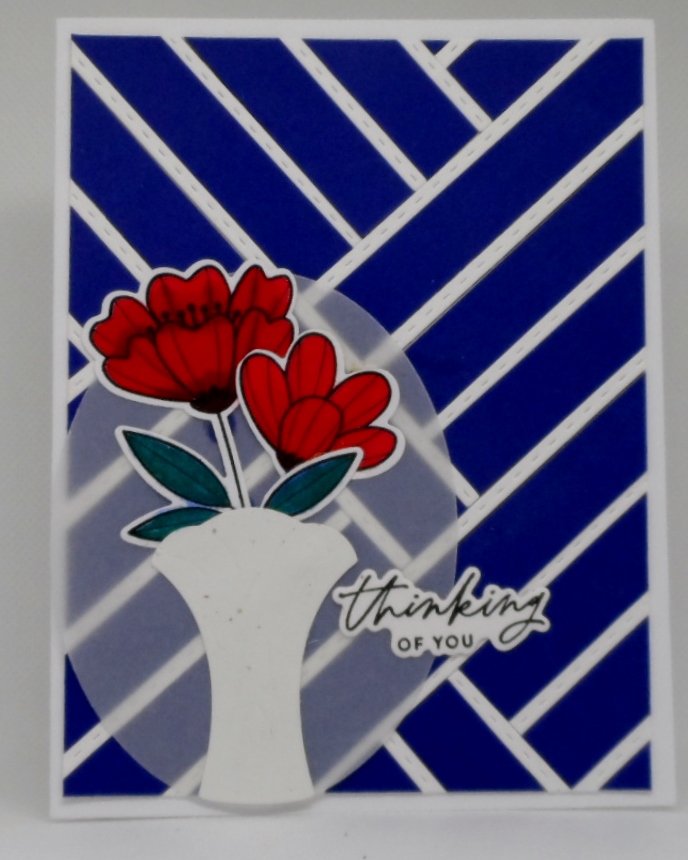 I thought that the color challenge of Red, White and Blue would be a great time to use my Taylored Expressions Pre-Printed Maps and some Easy Strips. The blue strips are 1/2″ and were cut with my trimmer but the white 1/8″ strips were die cut using TE’s stitched die. Using a sticky sheet, I was ready to start mapping. My flowers are TE Flower Market stamps & dies and the vase is also a TE product Versatile Vases. The sentiment is a SimonSaysStamp stamp & die included in their Sunflower Fields stamp & die set that I found in their sale section. A vellum oval was added behind my vase.