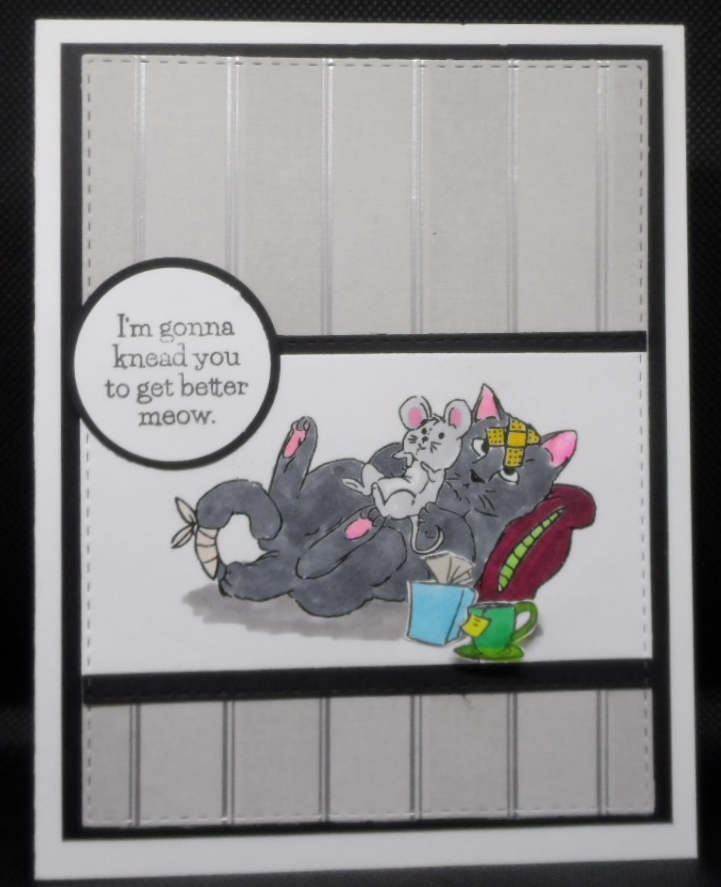 A cat challenge was on my mind and decided to use the Art Impressions Catastrophy stamp set which has several cute and funny get well cat images and sentiments. Colored my sick cat and her favorite stuffed mouse with markers, found a piece of shiny patterned paper that was still on my desk from a previous wedding card, Stampin Up circle punches and AI Rectangle Double Stitched dies to complete my card.