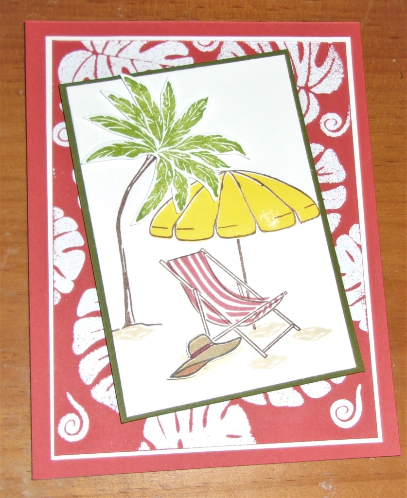 2. Beautiful tropical scene. I’ll take dibs on the beach chair. The embossed background really works well with your subtle colors of your beach scene. Hope your rain stops soon and you see some sunshine.