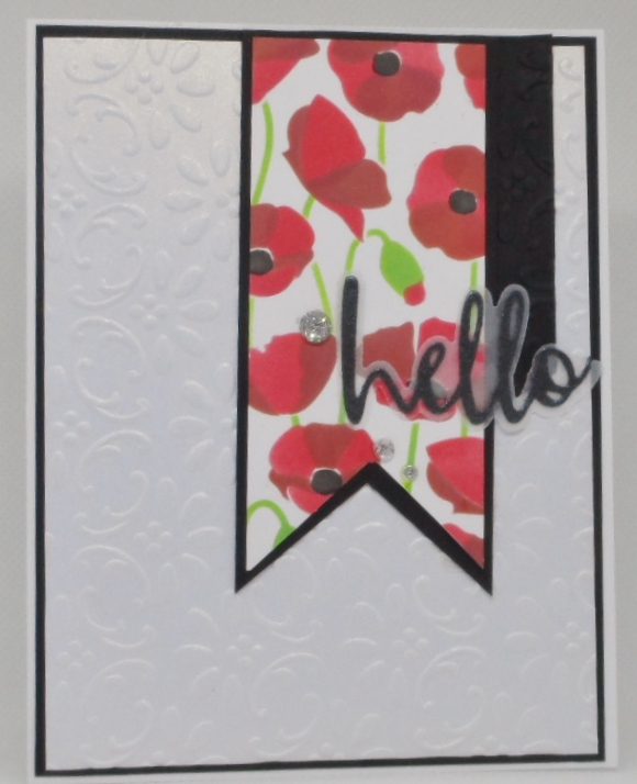 I was a little stuck with how to incorporate an embossing folder and poppies until I saw a card design on the Fans of Taylored Expressions Facebook group. I wasn’t sure how I could give credit to the original card but I appreciate that design. A StampinUp/Sizzix embossing folder was used on shimmer white cardstock. My poppies are from Taylored Expressions Poppy Fields layering stencil which was free with a purchase. SimonSaysStamp’s word and shadow dies as well as a few little sparkly bling embellishments complete my card today.