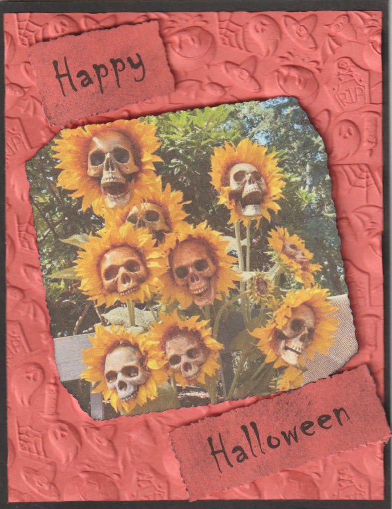 For today’s I used black and calypso coral cs. Embossed layer was done with Sizzix 3-D Halloween ef. For the picture I Googled skeleton sunflower clip art. Sentiment was printed on the computer. I used my antique photo paper cutter for the picture and word strips, then used a cotton ball with black stamp pad to darken the word strips and popped them all up.