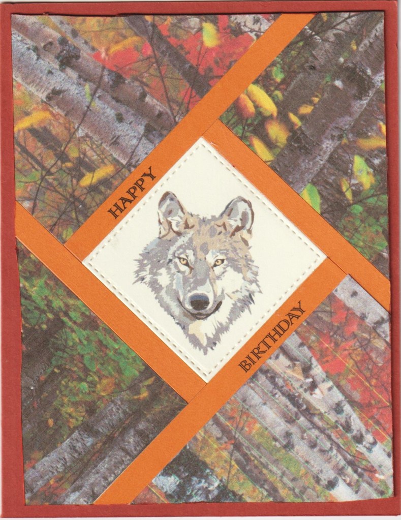 Hello and welcome. Today’s card is for my animal loving niece who especially likes wolves. Wolf image was found by Googling wolf clip art, pp was found by searching for fall woodsy background paper. My biggest challenge was printing “happy birthday” on a 1/4″ strip. Die used is Stitched Squares by Die-namics. I was not real sure about it till hubby said how much he liked it.