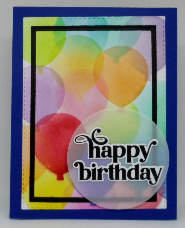 Using one balloon from Taylored Expressions Balloon Party layering stencils, I rainbow stenciled a balloon background. After masking areas around the chosen balloon, I started in the middle of the card background with a light red then filled in around that balloon trying to keep in rainbow order and not create any muddy balloons. After adding a TE frame and word sentiment popped up on a vellum circle, this card is finished. No extra gems or bling as this one may be included in my package for cards for troops.