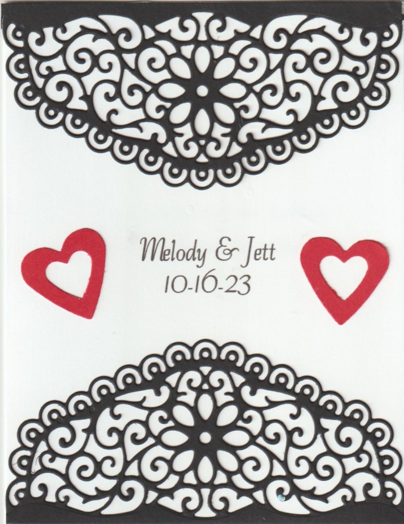 Die cut is Opulent Swirls by Gemini, hearts are from 2 hand punches. First I punched the small one then the larger one around it. This is the second wedding card I’ve made with this layout.