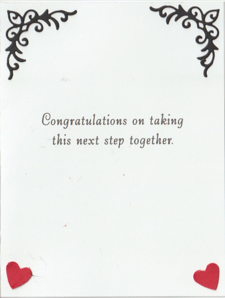 Hello and welcome. Today’s card is for two of the best servers ever. She’s our server and he is also a server at the same place. They’ve been together for several years and just the two of them are going to the courthouse, nothing fancy for these two, so, I decided on a very simple sentiment “Congratulations on taking this next step”.