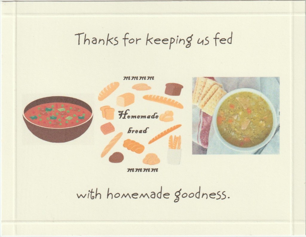 Hello and welcome. Today’s card is just a single layer post card. Our neighbor, who shares her grandson with us, is the best bread baker ever. She bakes bread very often and graciously shares it with us. Along with the bread these past two weeks she also brought over homemade vegetable & split pea soups. So, I thought it would be nice to add a thank you with the return of her dishes. The pictures are online clip art, and I scored 1/4″ on all 4 sides.