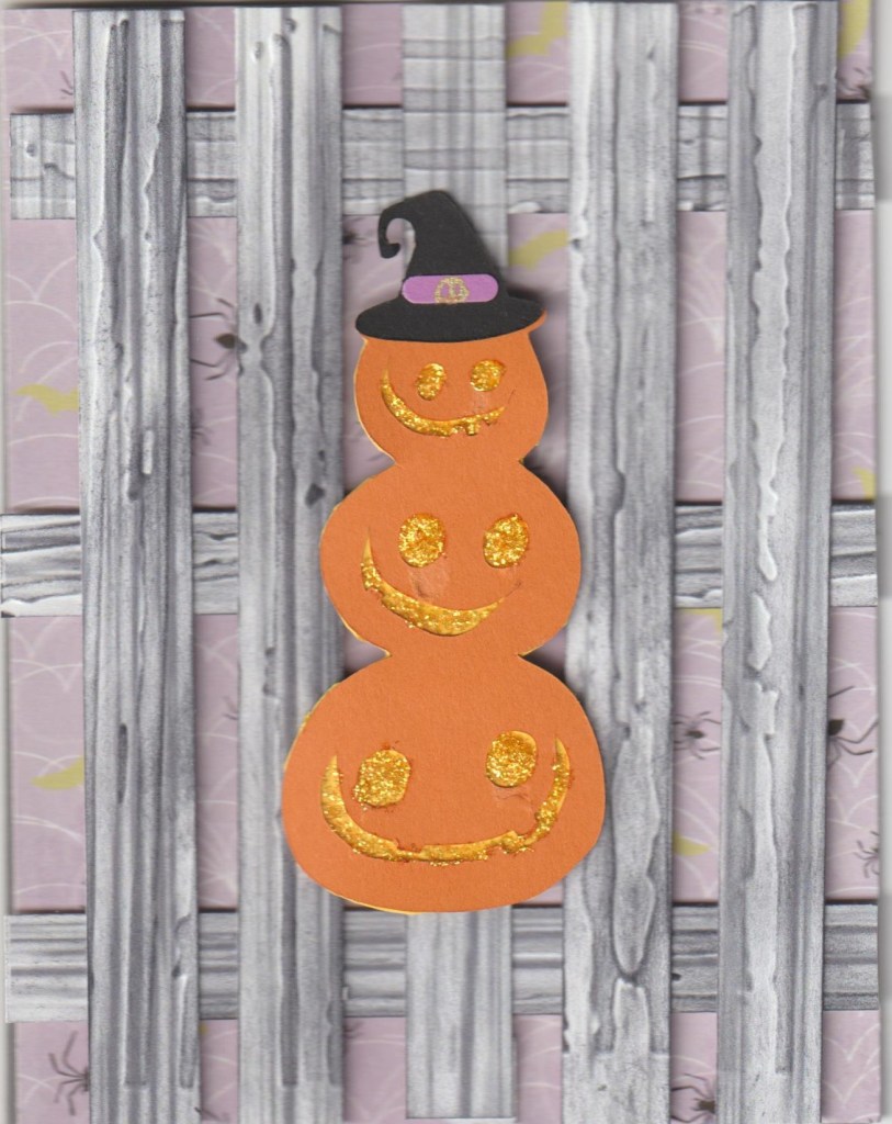 Hello and welcome. When I started this card, my intention was to give it to my nail gal, but it didn’t turn out like I had hoped. Pumpkin stack was cut on the Silhouette. The faces, that I used yellow Stickles on, ended up a little messy but hey, it’s a Halloween card so goofy faces are acceptable. Fence was made from woodgrain paper that was run through a tree bark ef by Cuttlebug, then I lightly sponged black ink on it and cut into 1/2″ strips. The “buckle” on the hat band was hand drawn with a gold metalic pen that was gifted to me. Fence and stacked pumpkin are popped up. Background paper is a light purple with spiders and webs on it. Even though I’m not really happy with it I still might give it to her.