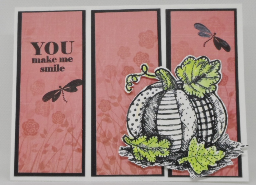It may still be farm tractor rides to the pumpkin patches and corn mazes at our local farms time but without leaving my house I picked this one of a kind quilted pumpkin from my stash. Last piece of this patterned paper from my stash that I was hoping not to mess up. I liked the soft illustration of wild flowers on it. My quilted white pumpkin is an old red rubber stamp from Serendipity Stamps names Quilted Pumpkin. I was inspired by a mood board and Buddy Johanna’s white pumpkins to follow suit. Sentiment is Gina K Designs So Many Sentiments and dragonflies are also GKD’s Dreams Take Flight.