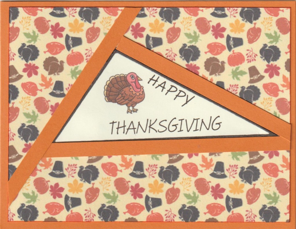 Hello and welcome. Today’s card has an interesting beginning. While watching Jeopardy one night this triangle shape was one of the clues and when I saw it, I told hubby I need to try that shape on a fractured card. So off to Google I went to find this shape triangle. After pasting the image into my Hallmark card program, I sized it then printed the sentiment and found the clip art turkey online. Since my fussy cutting didn’t work, I had hubby cut it with an exacto knife and ruler. I had used this pp on other cards but this time I sized it so the design printed smaller. Card stock is Pumpkin Pie from Stampin Up. This card is for our 24 year old grandson.