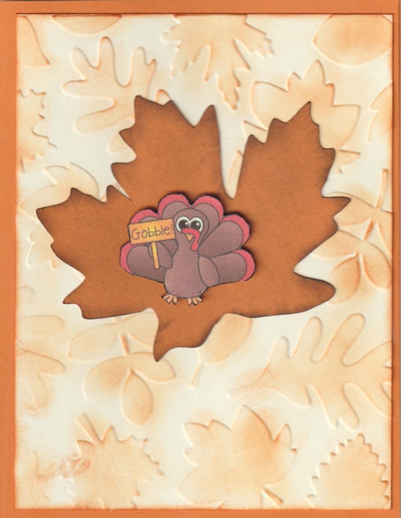 Cardstock is Stampin Up’s Pumpkin Pie, ef used is The Paper Place Leaves, focal leaf was cut on the Silhouette, turkey is computer clip art that I fussy cut. On the embossed layer I used a sponge dauber with Pumpkin Pie stamp pad, leaf was cut from Pumpkin Pie cs then sponged with Soft Sued stamp pad. Before fussy cutting the turkey I doubled the cs for a little stability then popped it up on the leaf.