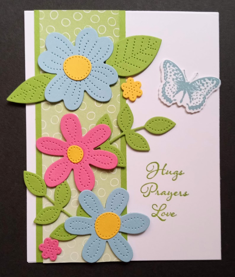I created this card last week and posted it on November 9. The colors are Granny Apple Green, Polished Pink, and Balmy Blue. The dessert is to add anything else and I chose Yellow. I used the Stampin Up Pierced Bloom dies for the flowers and leaves and used Positive Thoughts and matching dies for the greeting and the butterfly. This went to a woman needing encouragement. This card won an award as the Color Challenge Favorite. I have won this one other time, so I was surprised to see the post.