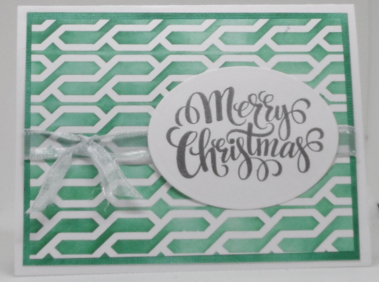 Using My Favorite Things Cable Knit stencil and Gina K Designs Christmas Pine ink, I inked my focal panel and inked the layering panel in the same color ink. Adding a silver embossed sentiment from Gina K’s Holly Jolly stamp set, a ribbon from my stash and Spellbinder’s oval nestabilities die completes this card today.