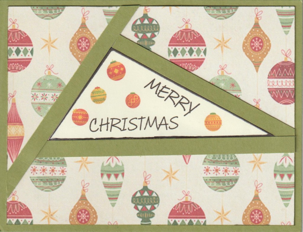 Hello and welcome. Since the first fractured Christmas card turned out ok, I decided to make a landscape one. I really like this pp I found online. Triangle shape was fussy cut, and the bulbs are computer clip art. It’s probably a strange design for a Christmas card but I’m kind of strange so it’s ok. We’ll give this one to our mail carrier.