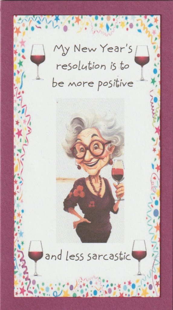 Today’s card is Dear Old Sister’s first chuckle of the month card for 2024. This time I decided on a mini slimline. As usual, border, images and sentiment “My new Year’s resolution is to be more positive and less sarcastic. Like I won’t screw that up right away.” were all found online. DOS loved it.