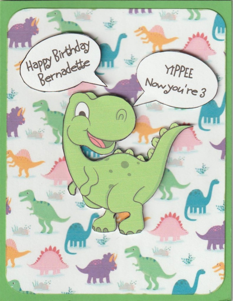 Hello and welcome. Today’s card is for our youngest great-granddaughter who loves dinosaurs. The pp was found online, dinosaur is computer clip art fussy cut and popped up, word bubbles are from and online coloring page, also fussy cut and popped up. Inside sentiment is paraphrased from a couple different ones. Since her dad and maternal grandpa always call her Bernadette, but everyone else calls her Bernie, I added her name both ways.