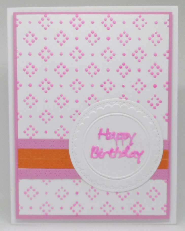 My card today was made using Taylored Expressions Dots of Diamonds embossing folder and TE’s Easy Strips 1/4″ Patterns Dies, a Sizzix embossing folder and lots of pink with a touch of orange. The dots on the embossing folder and the sentiment on the embossed circle die were all ‘very, very carefully’ inked with a pink marker. I believe that the sentiment must have been part of other embossing folders from Sizzix but it seems to have lost it’s companions.