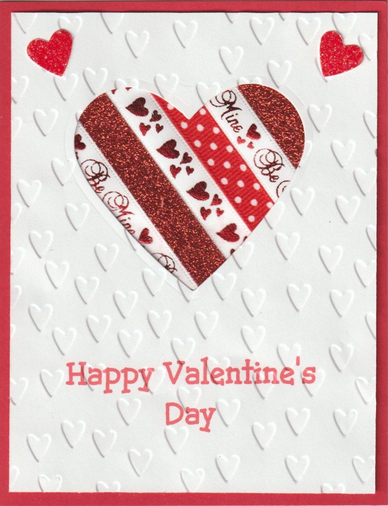 Hello and welcome. The idea for today’s card came from Pinterest. The cards I saw had strips of pp paper under the cut-out heart but when I looked at my ribbon stash on the wall, I thought why not use ribbon. After printing the sentiment and cutting the heart, SU’s Sweet & Sassy Framelits, I ran the cs through the SU hearts ef. Small hearts are hand punched from glitter paper.