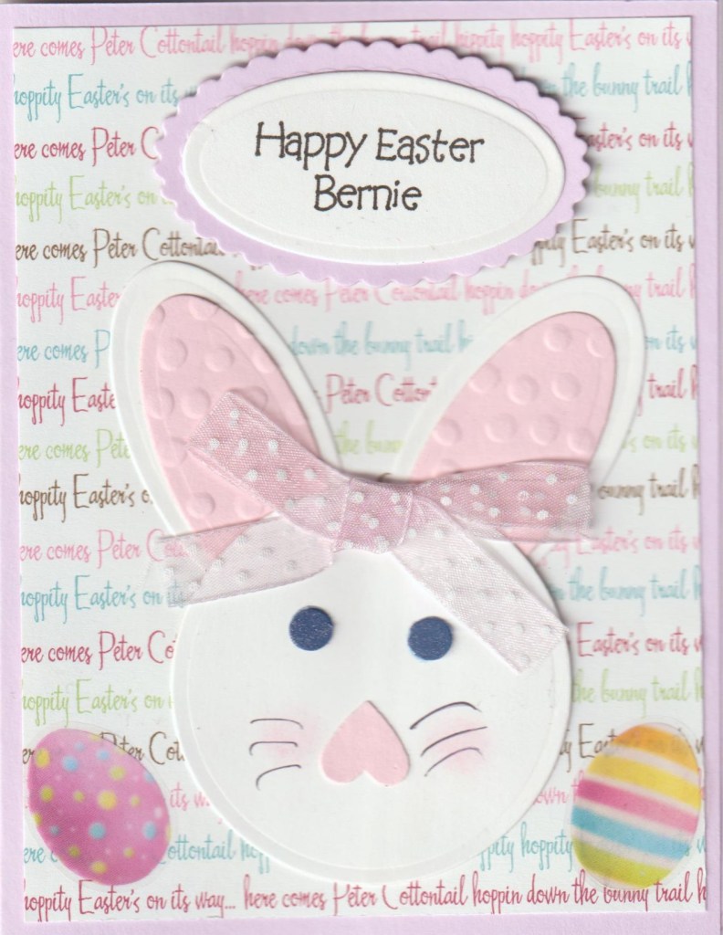 Your Bernie will love her Easter bunny card. I think it just looks like head tilt not crooked eyes. Fun fun card.