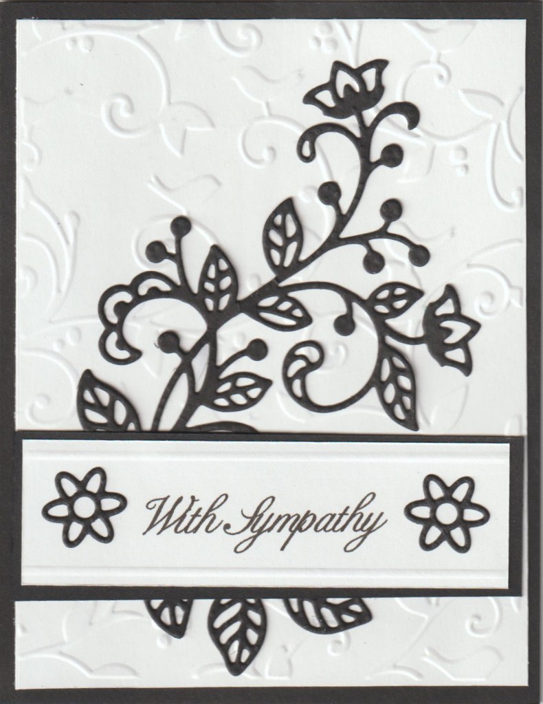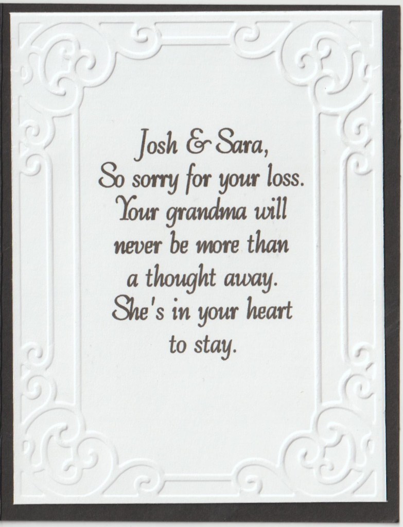 Hello and welcome. Our grandson-in-law’s grandma passed away this week, so this is the card I made. Die cuts are Flourish Thinlits by Stampin Up, embossing folders are both from Cuttlebug. Sentiment was printed on the computer, and I added score lines on top and bottom of panel. Inside sentiment is a combination of 2 different sentiments found on Pinterest. I don’t think I ever embossed the inside of a card before, but I think it adds a lot here.