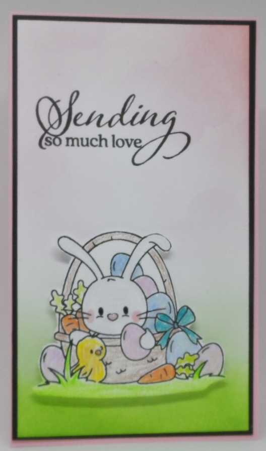 One Easter card for next year!!! I stamped this cute little image from SimonSaysStamp’s Sweet Tweets stamp set and didn’t use it for a card this Easter but when I saw a challenge of Bunnies and/or Chicks, I decided to make a card and save it for next year. A mini-slimline card with some light ink blending of green and pink left on my brushes for the focal panel. And can I just say, look at my sentiment!!!! OMG….Sending is one stamp and the so much love is a separate sentiment. Maybe they were meant to be nestled in each other like that but I can hardly believe that I didn’t mess it up. After fussy cutting the image I popped it up on dimensionals and it kind of gave a 3D effect. After struggling to make the glossy accents flow and adding to the eggs and a few other items, my card today is completed and will be sharing it with: