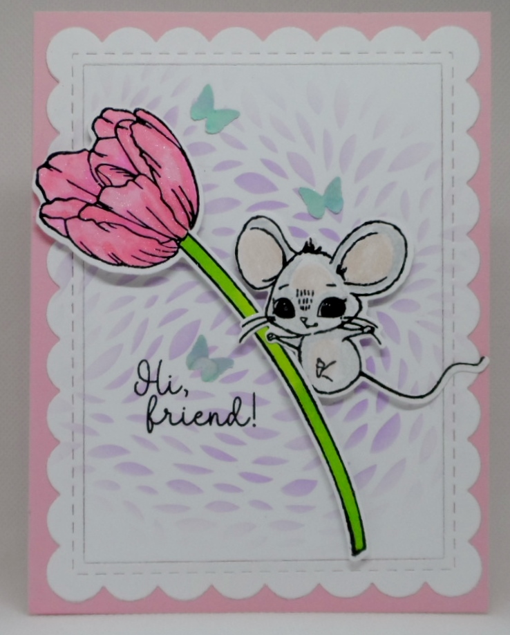 3. What as cute card. The mouse with the tulip is so sweet. The background is very soft and pretty. Congrats on your guest designer gig.