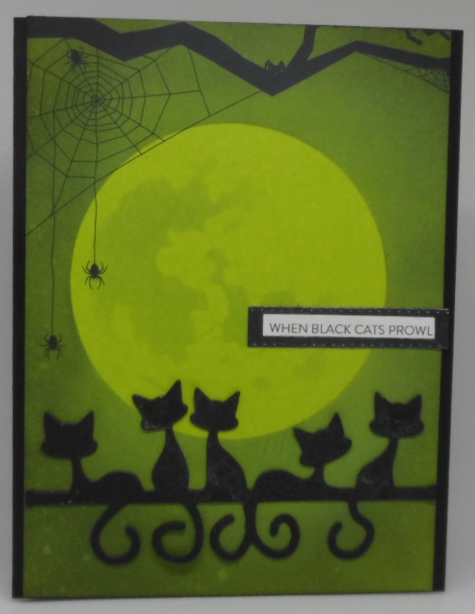 Taking inspiration from the mood board I decided on some patterned paper from my stash that included the tree branch, spider web and spiders, then place Tim Holtz Stapers Anonymous layering moon mask stencil on the background and blended some Distress Oxide ink in Iced Spruce and Black Soot to darken the panel, removed the mask and added the moon feature stencil and lightly ink blended on top of that too. The cat die is an unbranded die from my stash and sentiment is SimonSaysStamp preprinted sentiment strips.