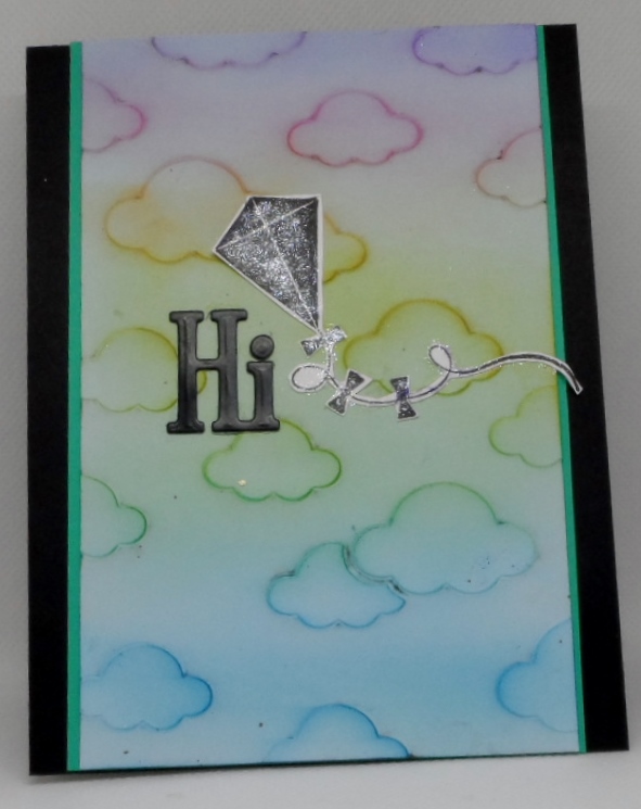 Our weather has either been rainy or windy and most days it’s both of those types of weather, so my weather themed embossing folder card today includes a Darice cloud embossing folder which I rainbox inked after embossing then put it back in the embossing folder and ran it through my Big Shot one more time to redefine the embossed clouds. A fussy cut kite from an older Gina K Designs StampTV kit Vintage Chic, some wink of stella and a Tim Holtz die cut sentiment completes this card.