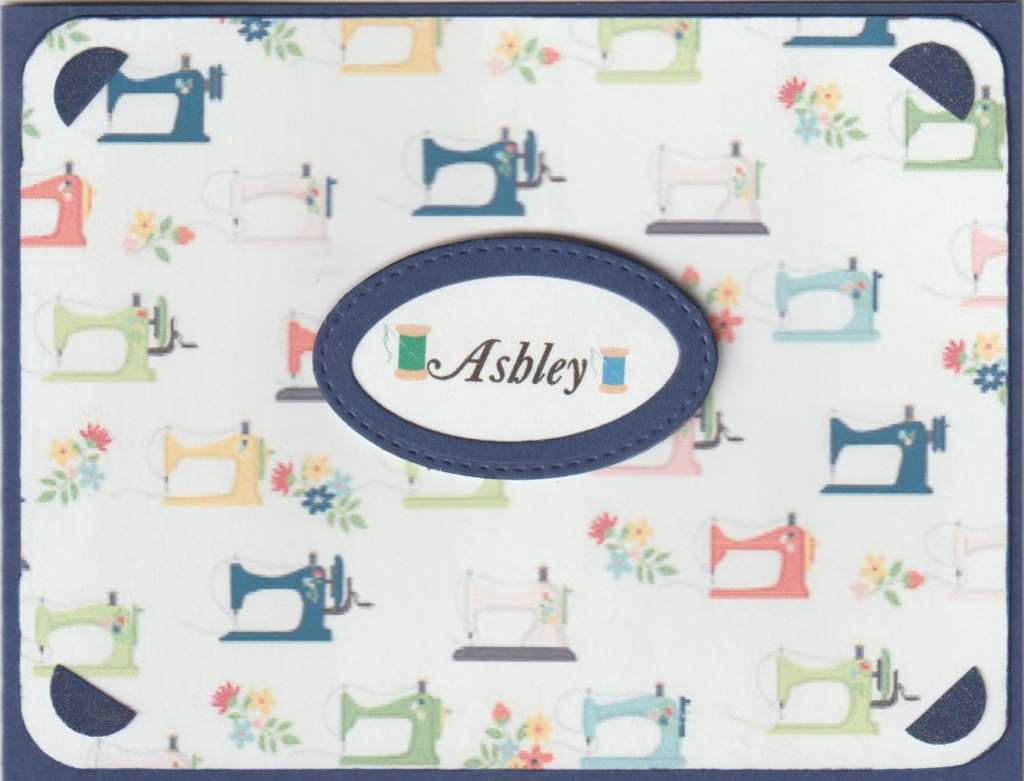 Our oldest granddaughter has her own business making therapeutic corn wraps, so I thought a sewing theme was best for her. Die cut is Stitched Ovals by Die-namics. Half circle corner pieces have Wink of Stella on them but that doesn’t show well in the photo. Spools of thread are clip art.