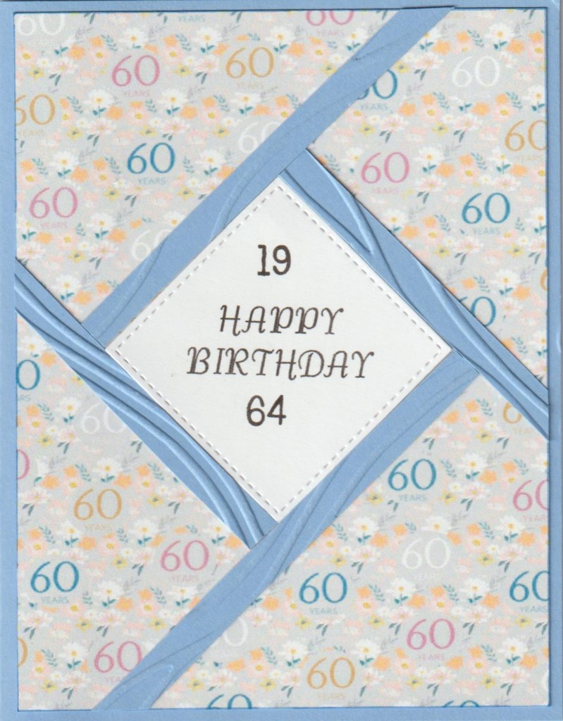 Again, background paper was found online. Center die is Stitched Squares by Die-Namics, sentiment was printed on the computer. The 1/4″ strips were run through Stampin Up’s Seaside embossing folder for a little dimension. Inside sentiment “At 60 years old, your birthday suit requires regular ironing.” was found on Pinterest.
