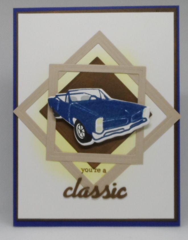Yes, he sure is a classic! Hard to find car images for my husband and his treasured ’64 Pontiac GTO classic car. This Altenew stamp & die set was kind of sort of close to his model car. After stamping and die cutting, layered it with some frames and kept with a blue and brown “masculine” color scheme. I may need a little more practice and it was fun to make but unfortunately I cannot repeat it for awhile.